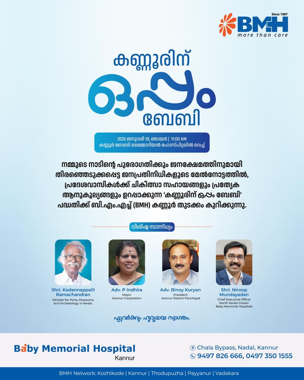 Baby Memorial Hospital (BMH), Kannur, has officially launched "Kannurin Oppam Baby," a flagship community outreach program designed to bring quality healthcare closer to the people of Kannur. The initiative was inaugurated by Shri. Kadannappalli Ramachandran, Hon. Minister for Ports, Museums, and Archaeology.