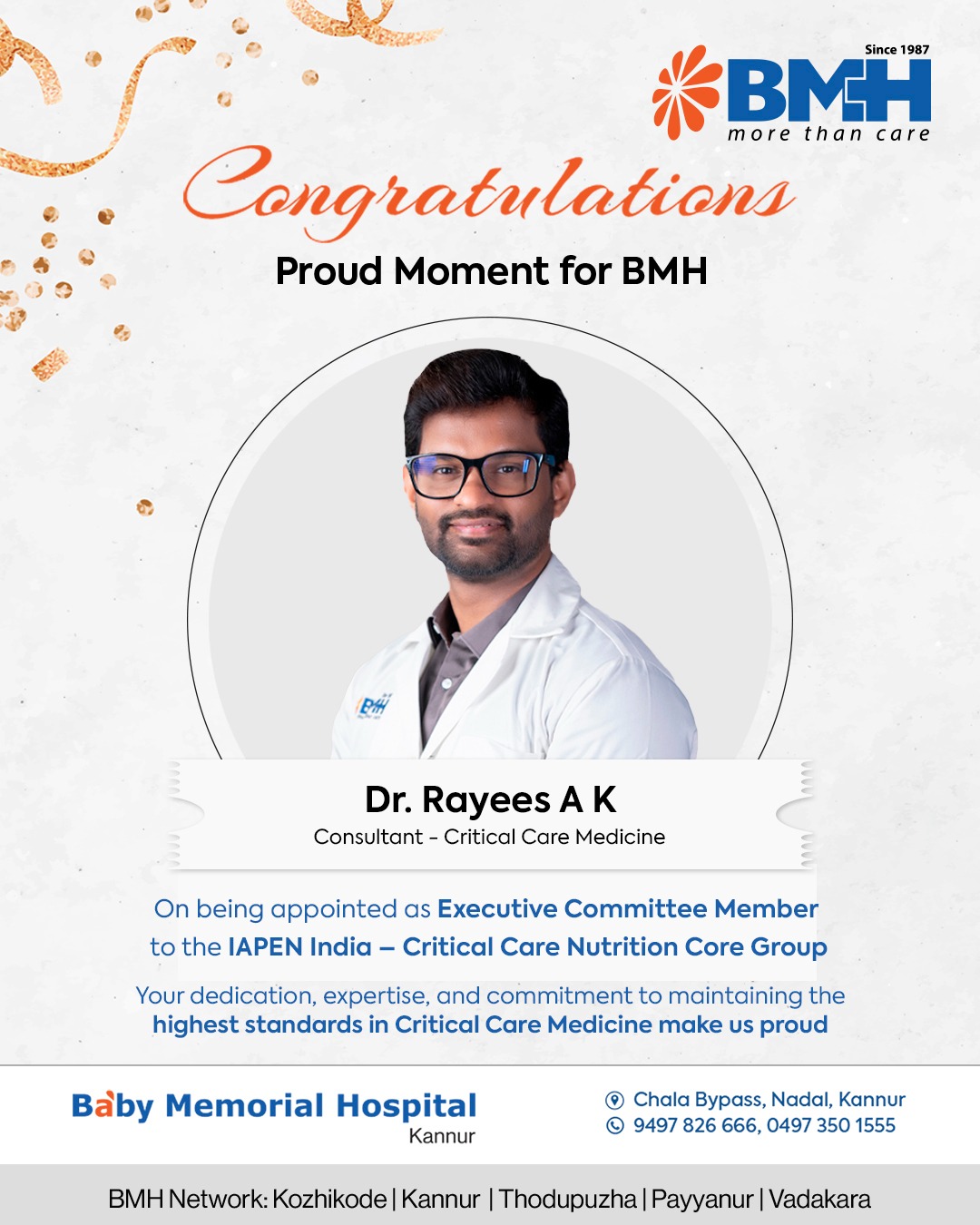 Baby Memorial Hospital, Kannur, is proud to announce the appointment of Dr. Rayees A.K. to the Executive Committee of IAPEN India – Critical Care Nutrition Core Group.