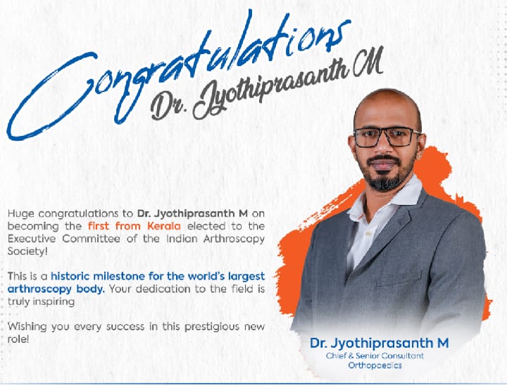 With years of experience and a strong commitment to patient care, Dr. Jyothiprasanth has consistently demonstrated excellence in arthroscopic surgeries and orthopedic treatments. His achievement highlights the growing recognition of Kerala’s medical professionals on a national and global stage.At Baby Memorial Hospital, we take immense pride in fostering medical excellence and supporting professionals who continue to push boundaries in healthcare. This milestone reinforces our commitment to delivering world-class treatment and advanced orthopedic care to our patients.We extend our heartfelt congratulations to Dr. Jyothiprasanth M and wish him continued success in his new role. His journey is truly inspiring and sets a benchmark for future medical leaders.