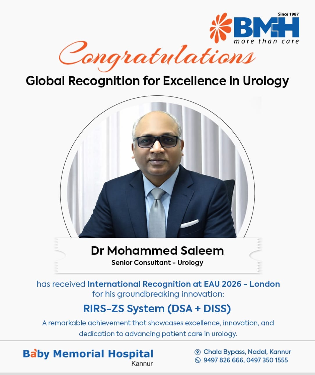 In a remarkable achievement that highlights excellence in modern healthcare, Dr Mohammed Saleem, Senior Consultant in Urology at Baby Memorial Hospital Kannur , has received prestigious international recognition at the European Association of Urology (EAU) 2026 held in London.This global acknowledgment was awarded for his pioneering innovation, the RIRS-ZS System (DSA + DISS) a breakthrough advancement in minimally invasive urological procedures. The innovation demonstrates a forward-thinking approach to improving surgical precision, patient outcomes, and overall treatment efficiency in urology.The recognition at EAU, one of the most respected global platforms in the field of urology, reflects Dr Mohammed Saleem’s dedication to clinical excellence, research, and continuous innovation. His work not only elevates the standards of urological care but also places Baby Memorial Hospital on the global medical map.This achievement is a proud moment for the medical community in Kannur and reinforces the hospital’s commitment to delivering world-class healthcare services. It also inspires future advancements in urology, ensuring better patient care through innovation and expertise.