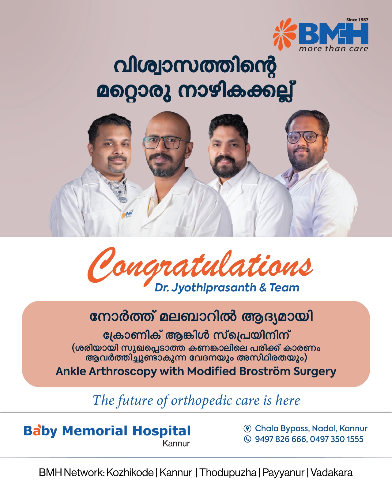 We are proud to announce a significant breakthrough in orthopedic excellence at Baby Memorial Hospital, Kannur. Under the expert leadership of Dr. Jyothiprasanth and his dedicated team, BMH has successfully performed North Malabar’s first-ever Ankle Arthroscopy with Modified Broström Surgery.