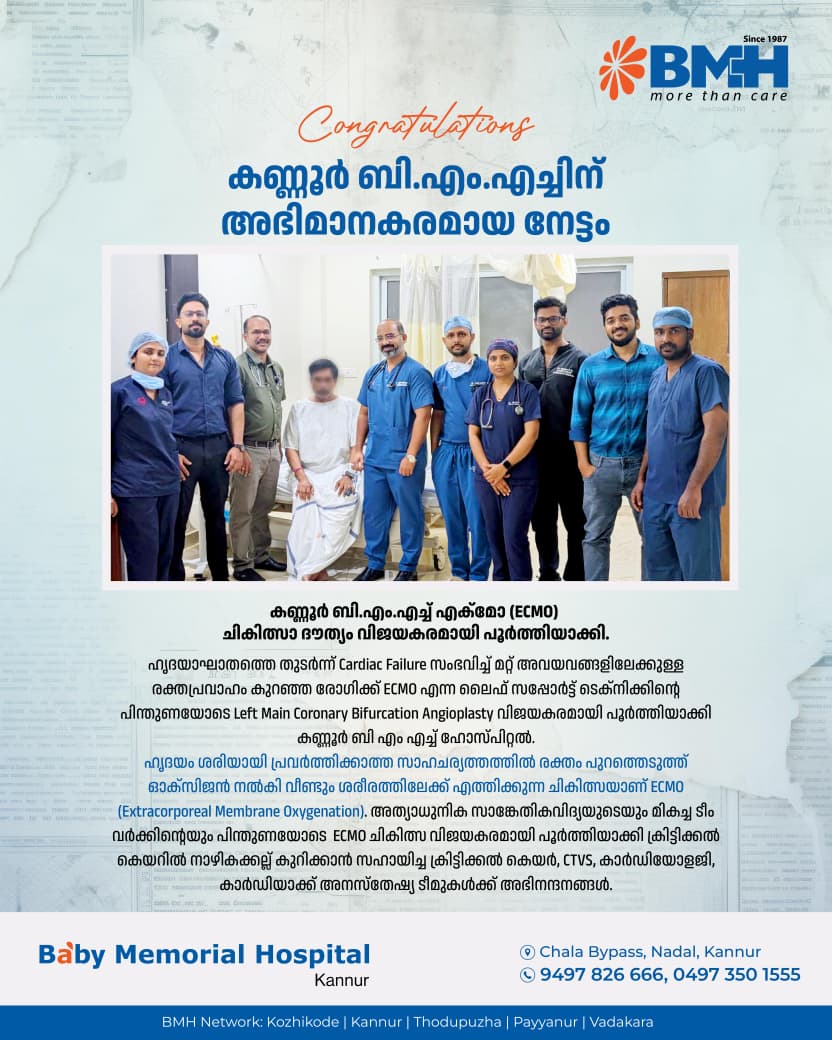 Baby Memorial Hospital, Kannur, successfully performed a complex and high-risk cardiac procedure using advanced ECMO (Extracorporeal Membrane Oxygenation) support, marking a significant milestone in critical cardiac care in the region. The patient, who was suffering from severe cardiac failure, underwent a Left Main Coronary Bifurcation Angioplasty with ECMO backup, ensuring continuous circulatory and respiratory support throughout the procedure. The multidisciplinary team of ctvs, cardiologists, critical care, cardiac anesthetists and perfusionists worked in coordination to ensure a successful outcome. This achievement highlights BMH Kannur’s capability in handling complex interventional cardiology cases with advanced life-support technologies, reinforcing its commitment to delivering world-class cardiac care.