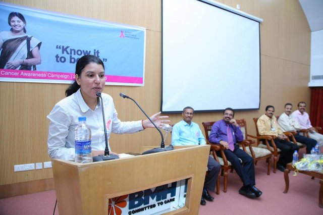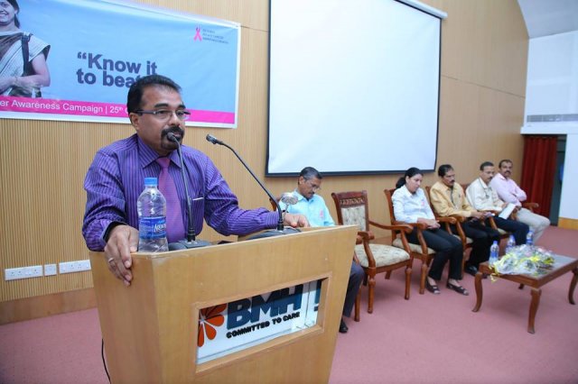 BMH inaugurated breast cancer awareness drive “Breast Cancer – Know it to beat it” on 25th October 2016. Mrs. Uma Behra – City Police Commissioner, Kozhikode was the chief guest for the event. Delivering the presidential address Dr. KG Alexander Chairman and Managing Director of Baby Memorial Hospital emphasized on the importance of early detection. The oncology team at BMH comprising of Dr. Sasindran PR, Head – Department of Radiation Oncology, Dr. Sajeevan, Sr. Consultant – Medical Oncology, Dr. Shaji Ayillath, Consultant – Surgical Oncology, Dr. Vishnu Rajan Nambiar, Jr. Consultant – Radiation Oncology and Dr. Dhanya K.S, Jr. Consultant – Radiation Oncology spoke during the event and answered questions from public. Hussain Cheruthuruthy, Director Wellness Foundation also spoke at the event. The event was well received with more than 300 people participating in the event.